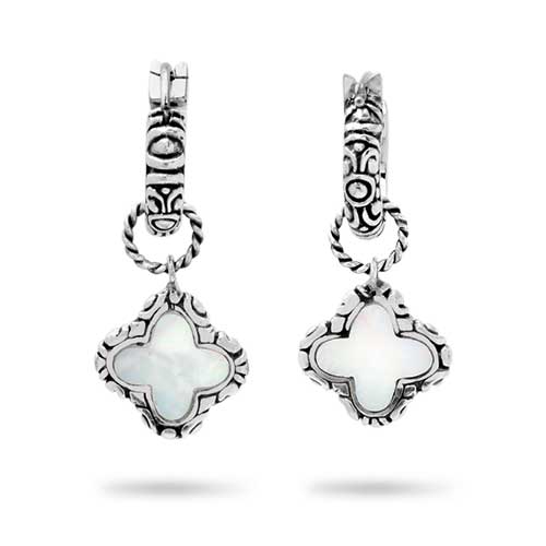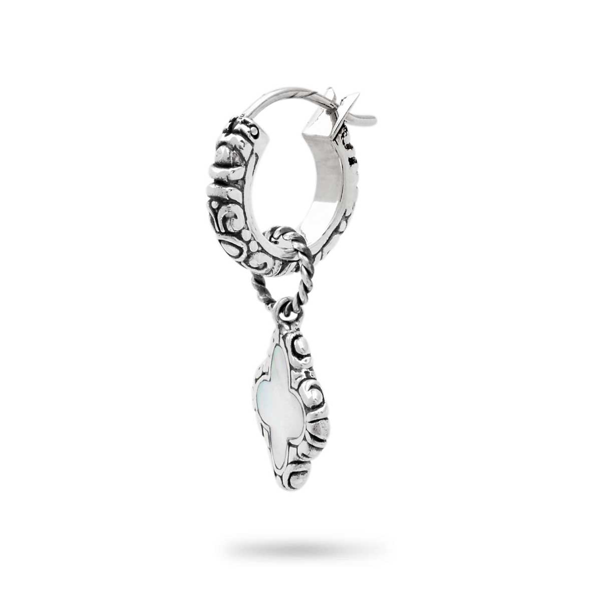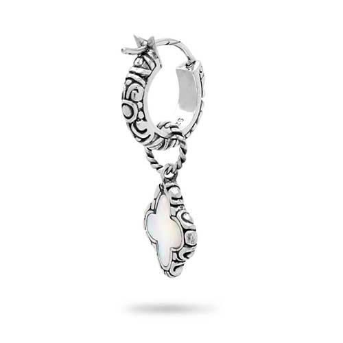Silver hoop earring, bali motif, flower shape, Shell MOP