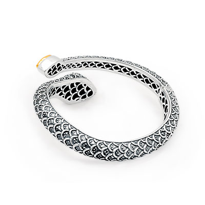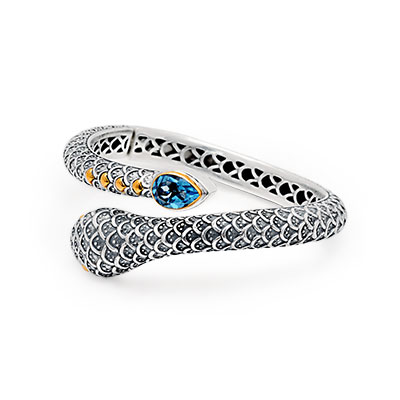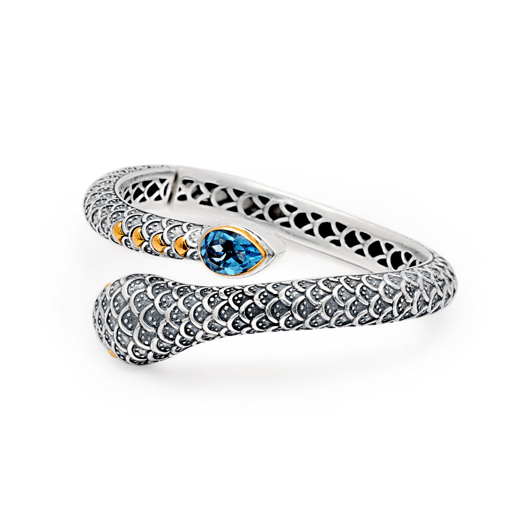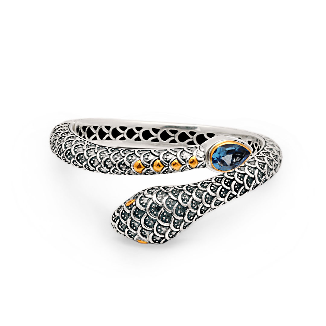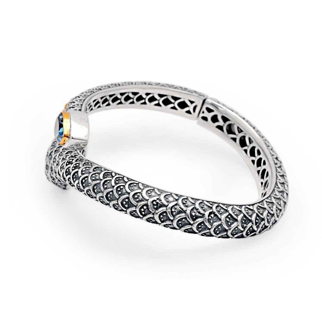 Silver and Gold snake cuff, Balinese motif, 18K gold bezel. Stone: Blue quartz.