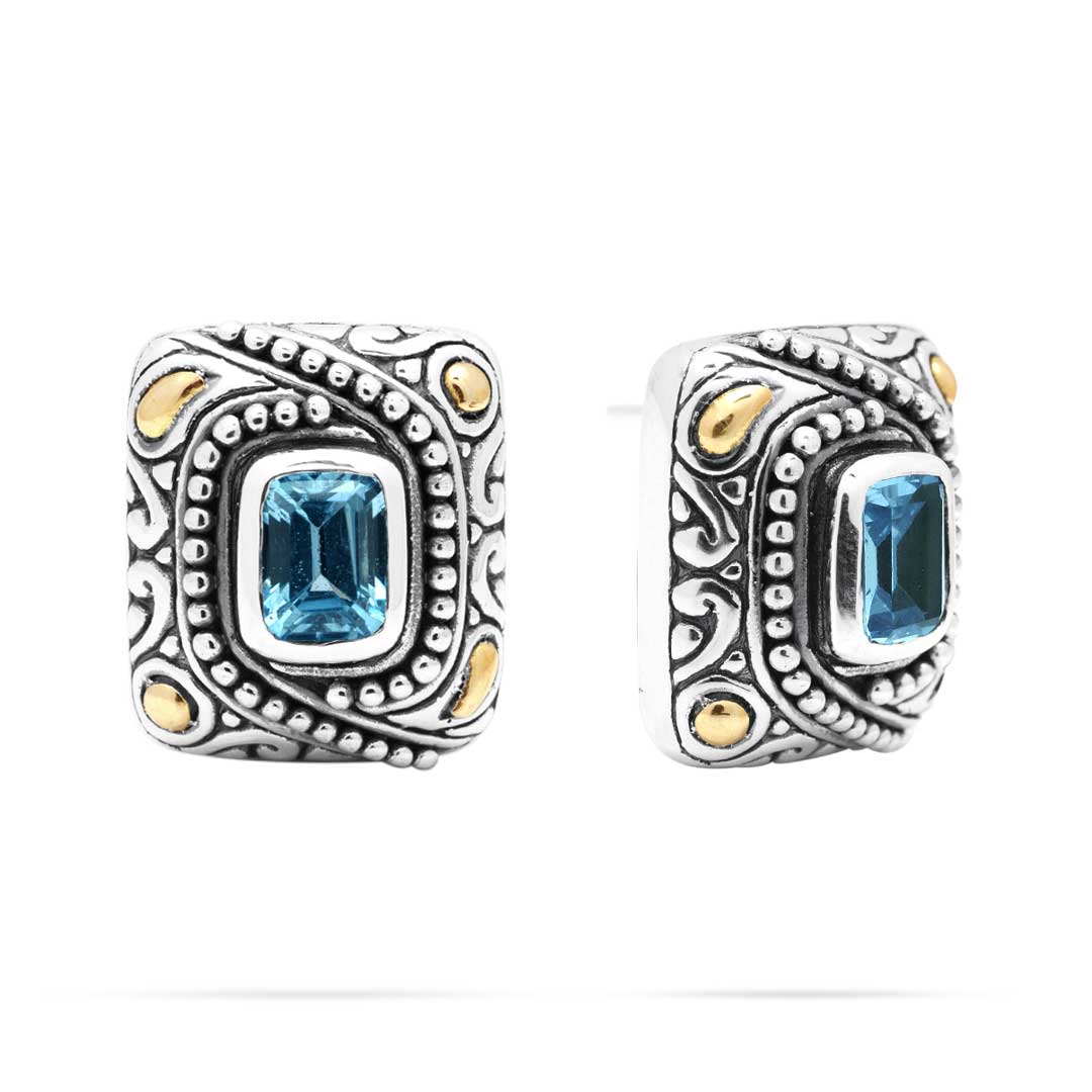 Gold and Silver Earring with Blue Topaz, Balinese motif