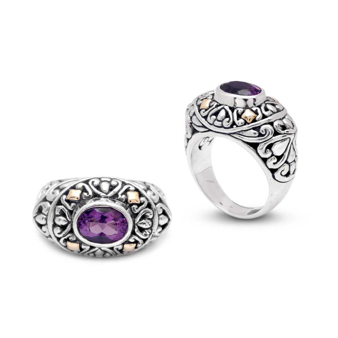 Silver and Gold Ring with natural Amethyst stones, Bali Motif