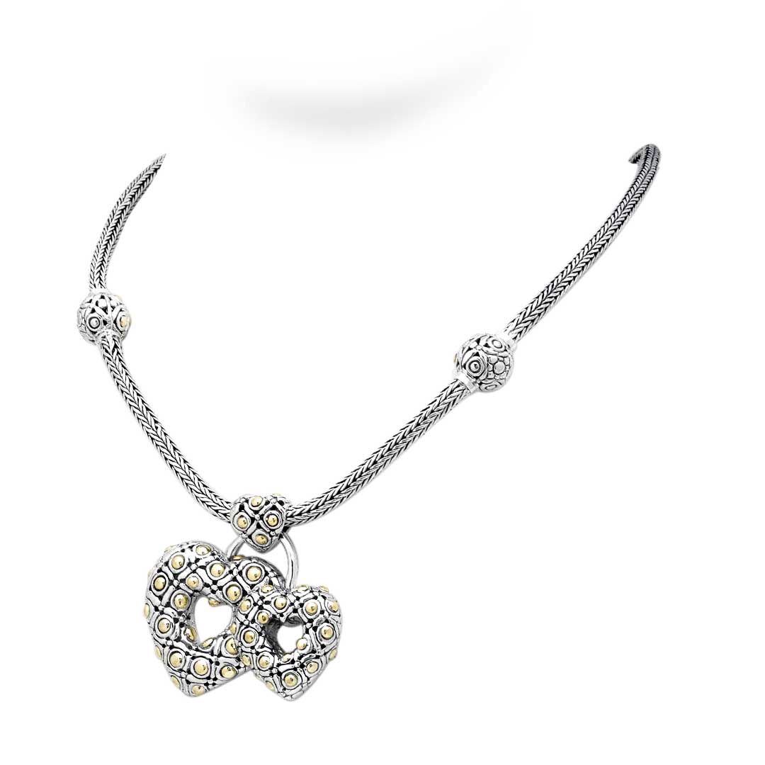 Gold and silver heart necklace with balinese motif, tulang naga chain oval