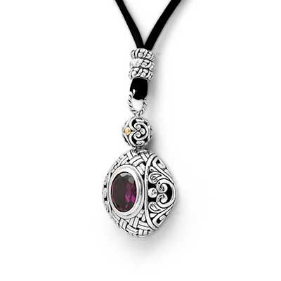 Gold and silver necklace with satin cord, Amethyst quartz stone and adjustable lenght