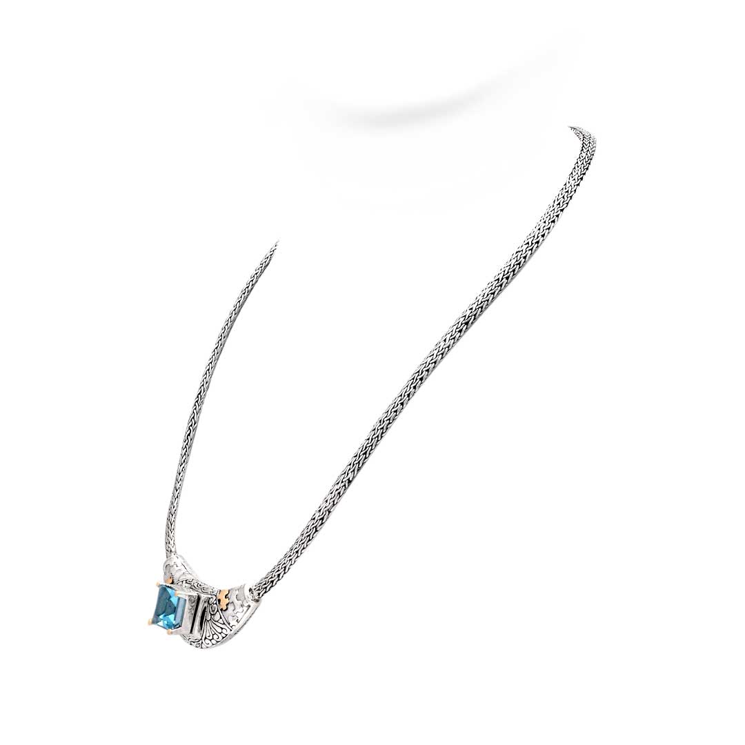 Gold & Silver necklace with puzzle motif. Exchangeable stones, blue quartz square