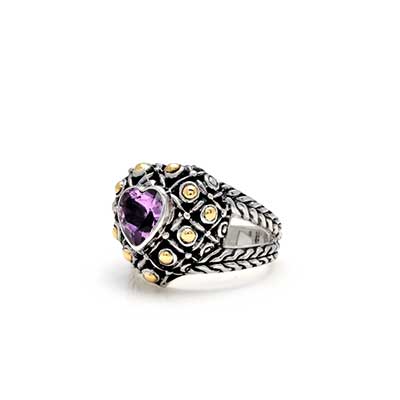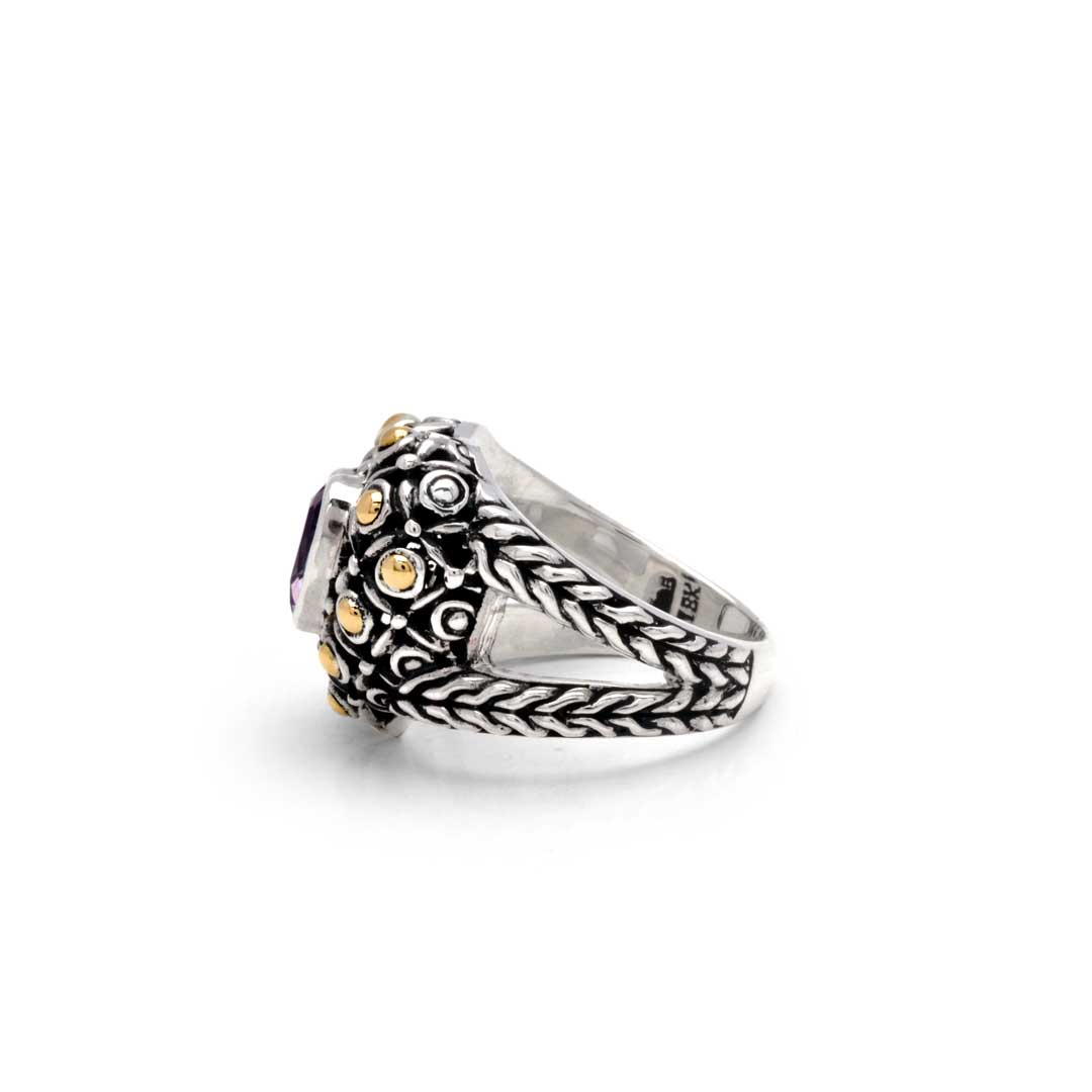 Silver and Gold Omega Ring with Amethyst, Soka Balinese Flower motif