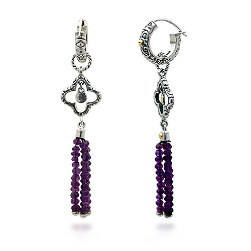 Gold & Silver hoop earring, bali motif, flower shape, Amethyst bead tasel - 3 strands