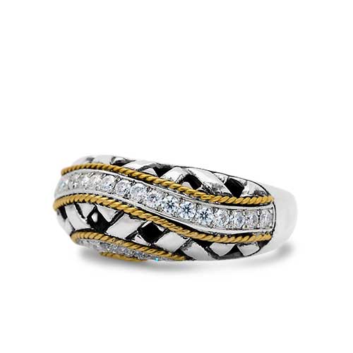 Silver and Gold Ring, Balinese Woven Motif, Moissanite